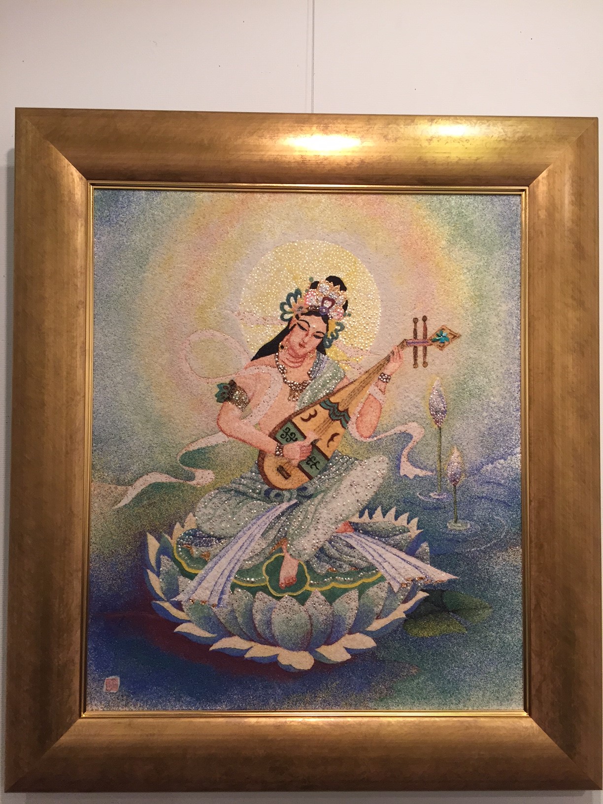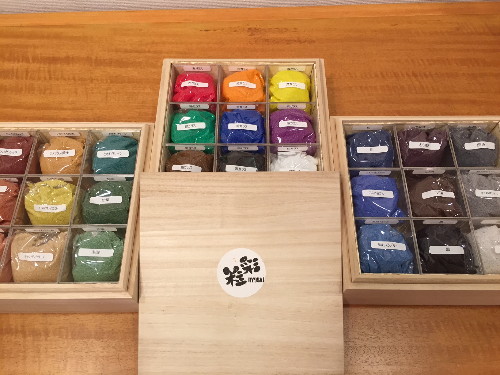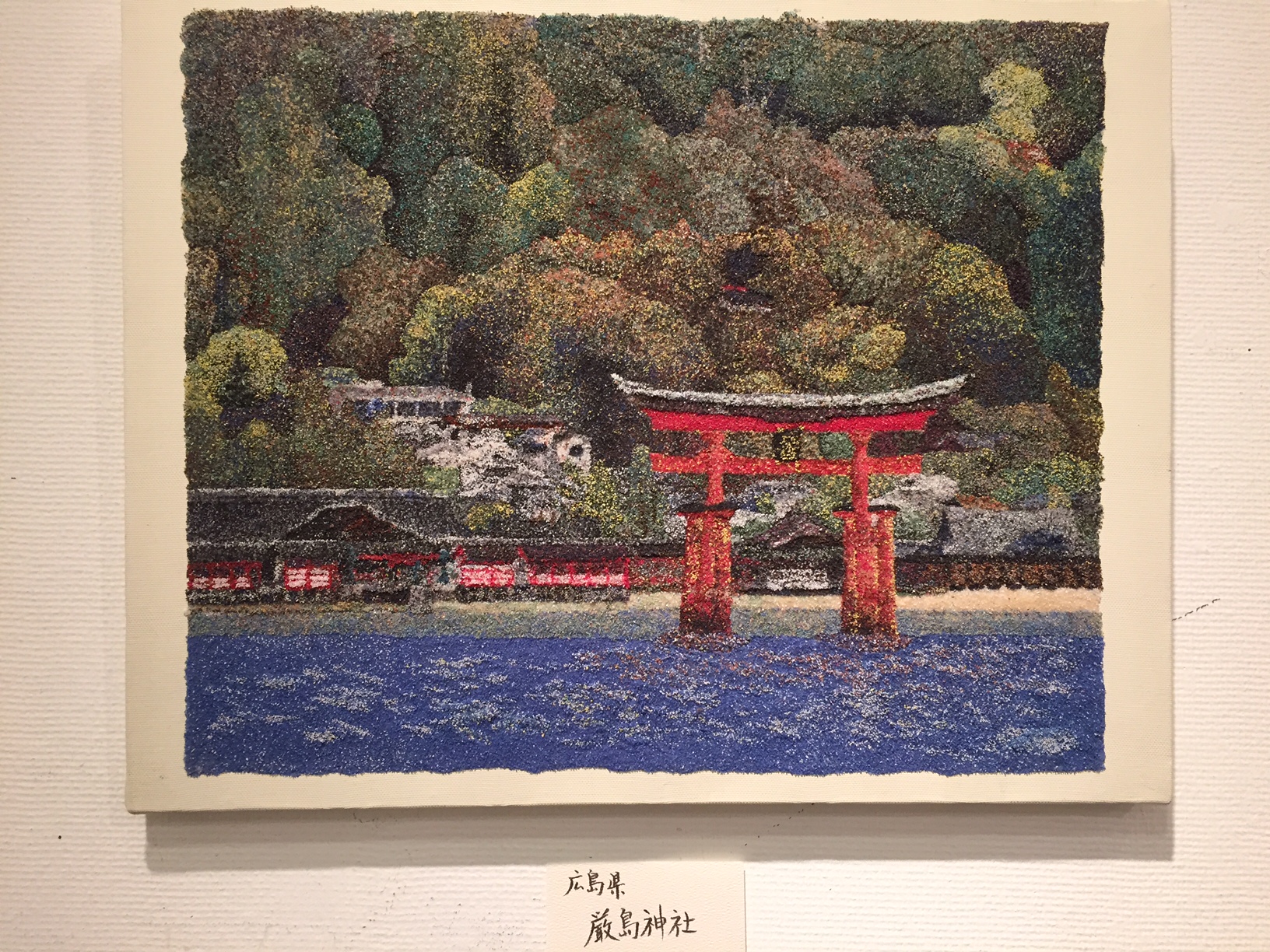 見せてもらったのは「粒彩の風景画」です。“粒彩”というのは、色の付いた砂で描きます。水彩でもなく、油絵でもなく、カラーサンドが絵の具の代わりです。