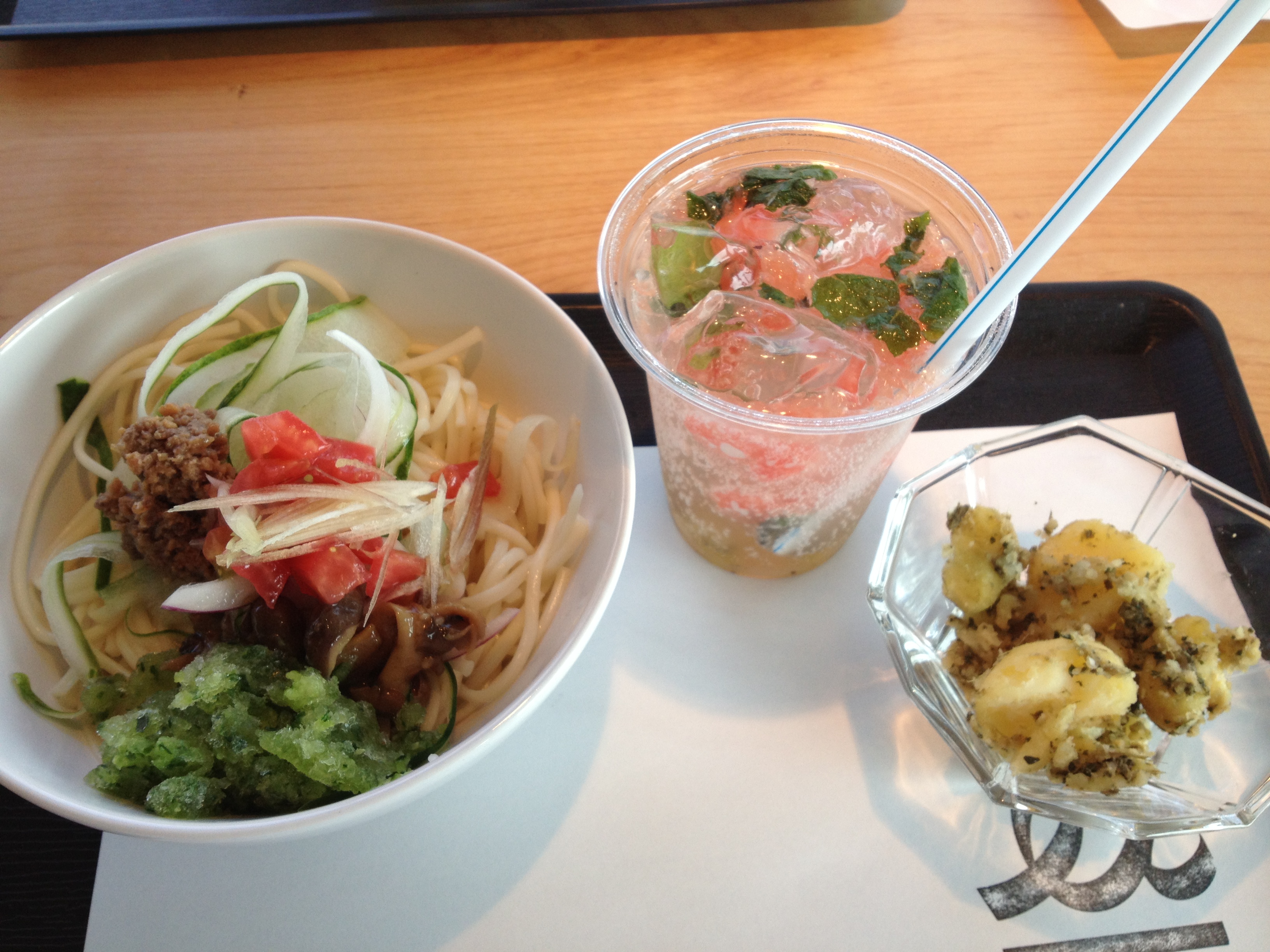 その太素麺に地元のトマトやみょうが、手作り肉味噌のトッピングに、