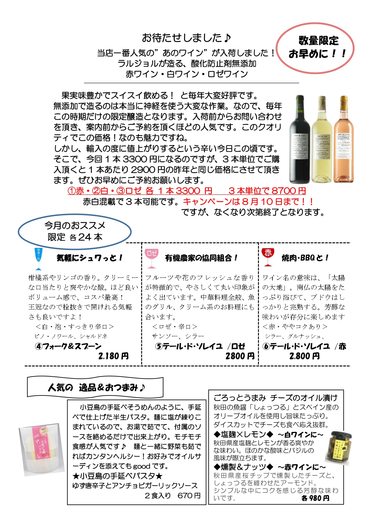 ①赤・②白・③ロゼ 各 1本3300 円